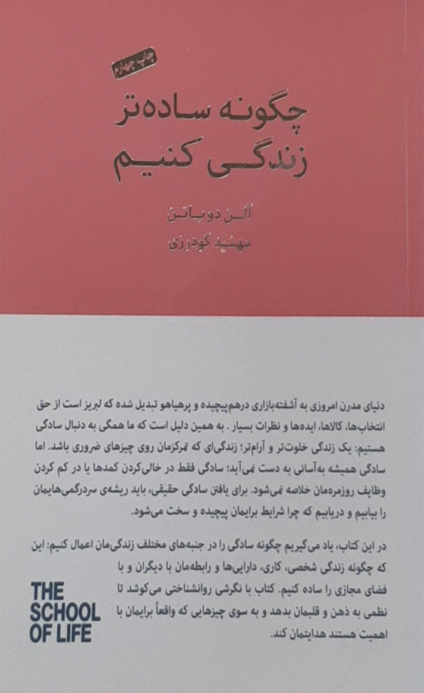 کتاب چگونه ساده تر زندگی کنیم نوشتهٔ آلن دوباتن و ترجمهٔ مهشید گودرزی است. انتشارات کتابسرای نیک این کتاب را روانهٔ بازار کرده است.